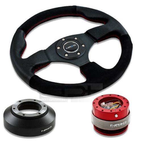 NRG-SRK-141H+012R-S+200RD, NRG Innovations 12.5" 320mm Black Leather Red Stitch Suede Grip Racing Steering Wheel Combo with 6 Hole Short Hub Adapter with Gen 2.0 Red Quick Release Kit SRK-141H