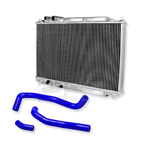 DPT, RA-HC06SI-2+RH-HC06SI-BL, Full Aluminum Performance Two Dual Row Core Chrome Radiator with Bolt On 3 Ply 4mm Blue Silicone Radiator Hoses Overall Size 26.75"x18.5"x4" for Manual Transmission Only .